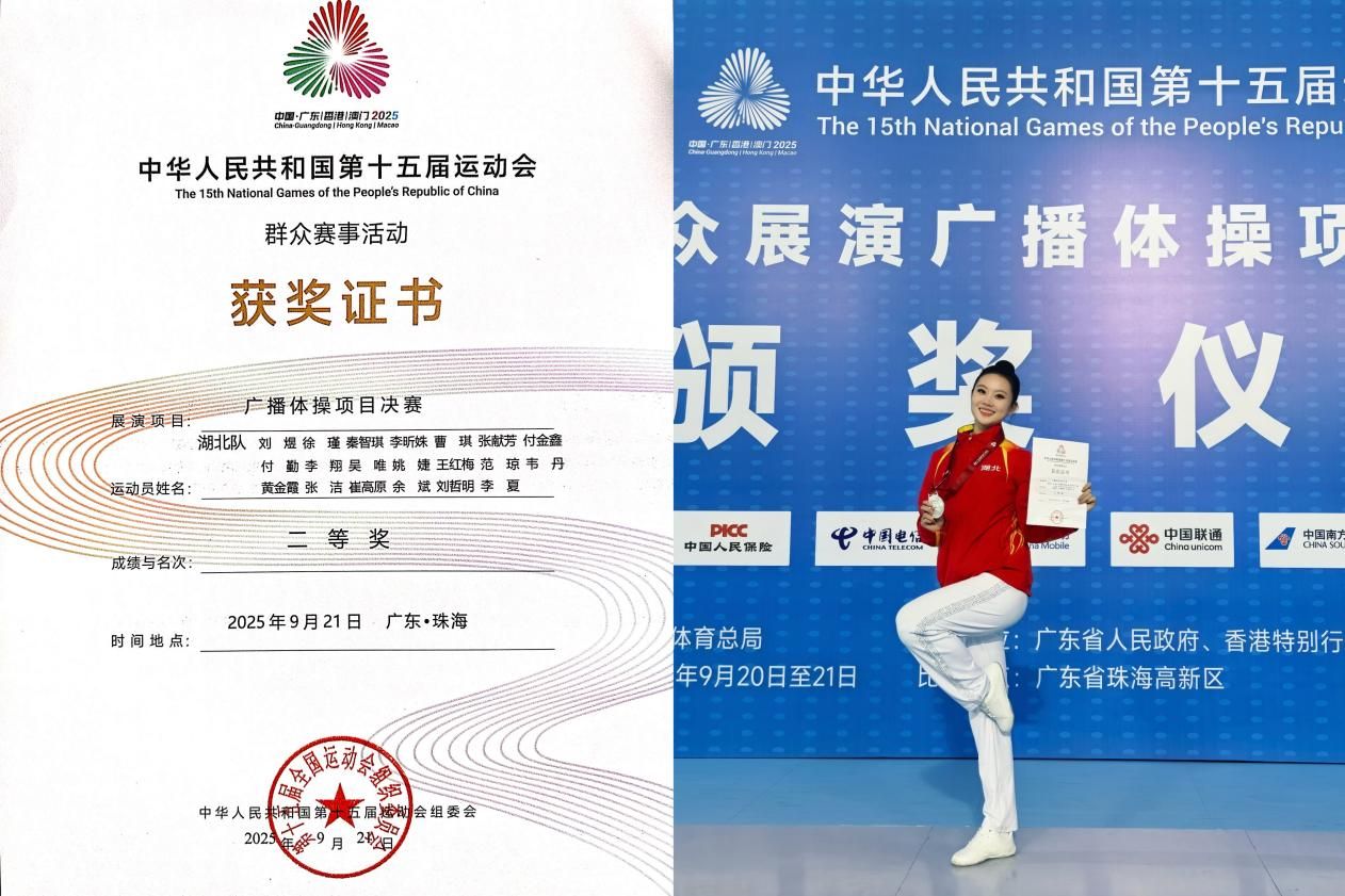 (通讯员 姚亚杰)在中华人民共和国第十五届运动会的群众赛事活动广播体操项目决赛中,湖北省代表队以出色稳定的现场表现,勇夺全国第二名。而在这支汇聚精英的队伍中,我校体育部李昕姝老师,如一颗璀璨的星,闪耀着独特的光芒。