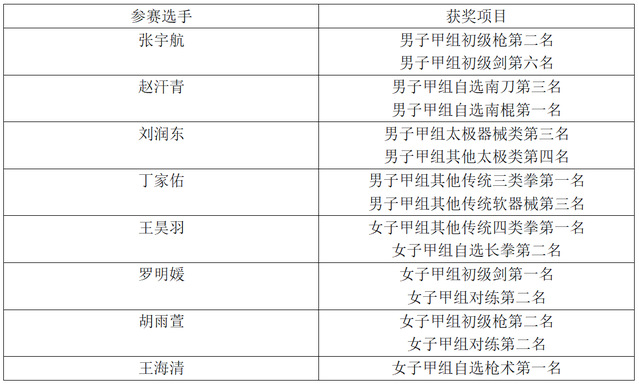 经过两天激烈角逐,我校武术队全体队员稳定发挥、顽强拼搏,在多个单项中取得佳绩,并最终荣获男子组团体总分第三名、女子组团体总分第二名的优异成绩。