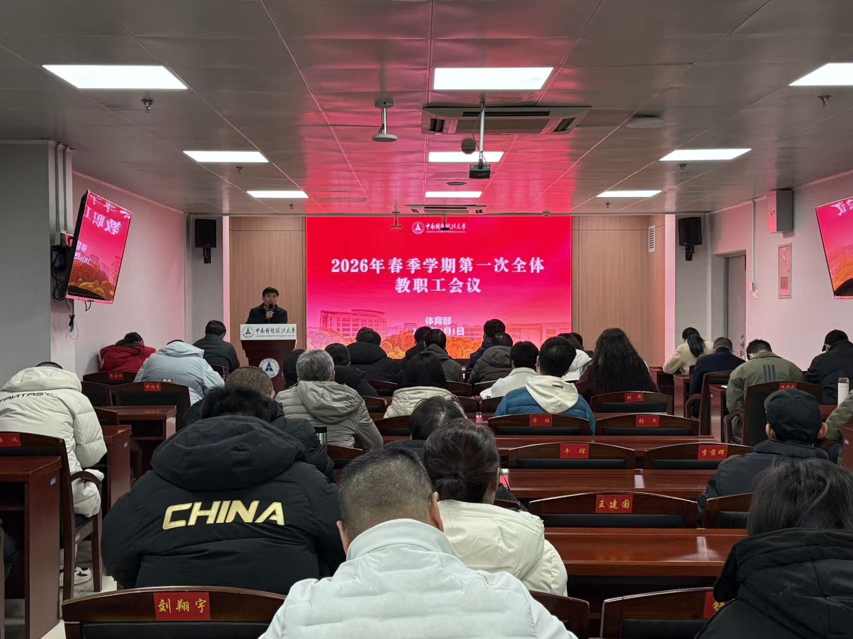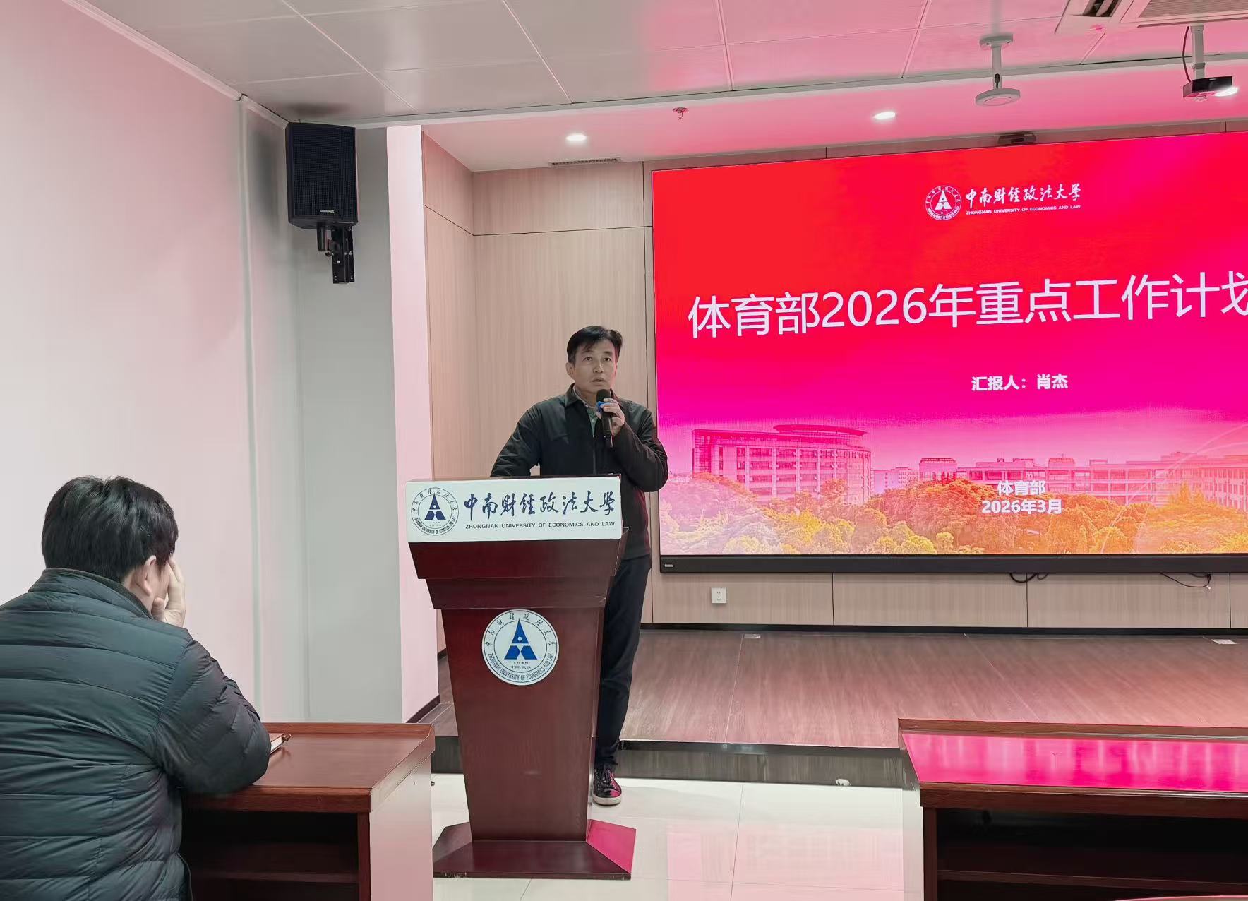(通讯员 姚亚杰)3月1日上午,体育部2026年春季学期第一次全体教职工大会在艺体中心顺利召开。体育部主任肖杰、党委书记傅小勇,副主任黄宏远、雷陈出席会议。会议由傅小勇主持,全体教职工参会,旨在部署新学期重点任务,为“十五五”规划开局之年体育工作谋篇布局。​